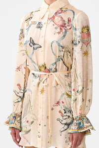 The House Of Horoscopes Shift Shirt Dress is a handcrafted silk silhouette designed by our in house artisans. Reimagined in an exclusive limited edition print, our shirt dress is relaxed fitting with a beautiful button through front that can be cinched and shaped with a detachable waist tie. It's finished with full length, flowy, blouson sleeves and intricately placed crystal embellishments. - 100% Silk - Detachable Waist Tie - Blouson Sleeves - Button Through Front - Crystal Embellishment SKU 00036647-HOUSHORO-XXS Size and Fit Our model is 5'10 (178cm) tall and wears a size S (AU 10). Bust: 40in (101.6cm) Waist: 26.5in (67cm) Hips: 38in (96.5cm) Designed as a relaxed fit. Take your normal size, or select one size smaller for a neater fit. Fabric and Care 100% SILK Silk satin embodies a sumptuously smooth finish that offers a rich buttery touch to the skin. As a result of the satin weaving technique, it masterfully creates a fuller bounce to the body and drape details.