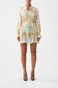 The East Of Istanbul Shift Shirt Dress is a handcrafted silk silhouette designed by our in house artisans. Reimagined in an exclusive limited edition print, our shirt dress is relaxed fitting with a beautiful button through front that can be cinched and shaped with a detachable waist tie. It's finished with full length, flowy, blouson sleeves and intricately placed crystal embellishments. - 100% Silk - Detachable Waist Tie - Blouson Sleeves - Button Through Front - Crystal Embellishment SKU 00036633-EASTISTA-XXS Size and Fit Our model is 5'10 (178cm) tall and wears a size S (AU 10). Bust: 40in (101.6cm) Waist: 26.5in (67cm) Hips: 38in (96.5cm) Designed as a relaxed fit. Take your normal size, or select one size smaller for a neater fit. Fabric and Care 100% SILK Silk satin embodies a sumptuously smooth finish that offers a rich buttery touch to the skin. As a result of the satin weaving technique, it masterfully creates a fuller bounce to the body and drape details.