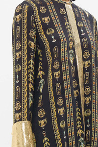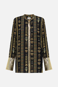 Fabricated with breathtaking precision and awe inspiring luxury, this collector's treasure is a CAMILLA best-selling creation. The They Call Her Nefertari Shirt With Gilded Mesh Placket And Cuffs depicts an ancient world of ankhs, scarabs, Egyptian phoenixes, and majestic gods. This luxury silk shirt features a relaxed fit throughout the body that flows from the sleek stand collar. Th chic metallic gold gilded mesh placket conceals a snap button enclosure and is paired with generously wide cuffs upon the full length sleeves. - Lovingly Handcrafted - Designed in Australia - CAMILLA Ready-To-Wear - Glomesh front placket & cuffs - Relaxed fit - Press studs down front placket - Back yoke - Stand collar - Back yoke seam - Can be worn as a matching set SKU 00032919-THEYCALL-XXS Size and Fit Our model wears a CAMILLA S and is 5'10 (178cm) tall. Her standard dress size is an AU 10. She has a 32in (83cm) bust, 35in (89.5cm) hips and a 25in (66cm) waist. Camilla S = AU10 / UK10 / US6 Designed as a relaxed fit take your normal size Fabric and Care 100% SILK With its subtly textured surface, silk crepe is our core fabrication made perfect for versatile wear. With its ability to hold alternative ways to wear, this decadent fabric drapes elegantly off the body whilst keeping you cool with its breathable nature.