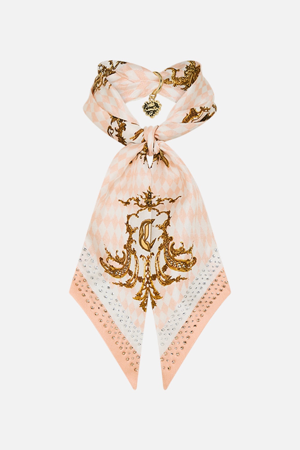Designed in Australia, The Queens Quarters Skinny Neck Scarf With Trinket is inspired by the interiors of the Palace of Queluz—framed florals, ornate borders, and intricate ceiling and floor details echo its regal charm. Lovingly handcrafted, this silk skinny neck scarf is adorned with a crystal charm trinket, exuding timeless luxury with every delicate fold. - CAMILLA Printed Silk - Crystals - Charm Trinket SKU 00034275-QUARQUEN-O/S Fabric and Care MAIN: 100% SILK Silk twill is renowned for its diagonally-patterned weave and fluid texture. Its high thread count ensures rich density and durability, while its beautiful sheen provides a luscious touch to the skin.
