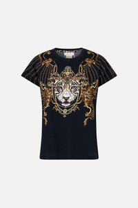 Designed in Australia, Baroque Around The Clock Slim Fit Round Neck T-Shirt - Black celebrates the architectural beauty of Portugal’s most stunning churches, evoking a sensory journey that blends memories and wanderlust into each hand illustrated design. Lovingly handcrafted, this luxurious graphic t shirt features a slim fit throughout the body that falls to a hip length hemline. The lush short sleeves echo the slim silhouette adding a feminine element to this elevated staple piece. - Slim Fit T-Shirt - Rib Neckline Bind - Short Sleeves - Crystal Embellishment - Non-Sheer SKU 00034022-BAROCLCK-XXS Size and Fit Designed as a slim fit, take your normal size Fabric and Care 100% COTTON