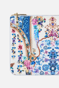 The All About That Lace Small Canvas Clutch is a handcrafted silhouette designed by our in house artisans. Reimagined in an exclusive limited edition print, meticulous artisan detail meets our signature canvas clutch as finishings incorporate contrast piped edges, meticulously placed crystal embellishments, zip top enclosure and a custom made parrot clip. Internal pocket and generous main compartment keep treasures stored in style. - Crystals - Removable Charm With Parrot Clip - Internal Pocket - Piped Edge - 26cm X 18.5cm SKU 00038206-ABOULACE-O/S Size and Fit Our model wears a CAMILLA O/S and is 5'10 (178cm) tall. Her standard dress size is an AU 10. She has a 32in (83cm) bust, 35in (89.5cm) hips and a 25in (66cm) waist. Fabric and Care MAIN: 100% POLYESTER