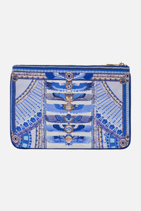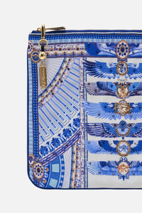 Designed in Australia, The Dancing With Daylight Small Canvas Clutch embraces the ethereal charm of ancient realms. Blue and white hues mingle with delicate flecks of gold, capturing the timeless elegance and divine light of deities. Lovingly handcrafted, this CAMILLA clutch bag showcases a streamlined rectangle silhouette adorned with contrast piped edges, a zip top enclosure, and finished with a custom made parrot clip. The internal pocket and generous main compartment keep your treasures stored in style. - Crystals - Tassel With Parrot Clip - Internal Pocket - Contrast Piped Edge - 26Cm X 18.5Cm SKU 00032357-DANDAYL-O/S Size and Fit Our model wears a CAMILLA O/S and is 5'10 (178cm) tall. Her standard dress size is an AU 10. She has a 32in (83cm) bust, 35in (89.5cm) hips and a 25in (66cm) waist. Fabric and Care MAIN: 100% POLYESTER