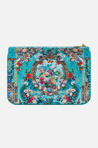 Designed in Australia, The Gardens Of Queluz Small Canvas Clutch invites you into Queluz Palace, where vivid greens and lush florals blend with the elegance of Azulejo tiles, celebrating nature and artful design. Lovingly handcrafted, this CAMILLA clutch bag showcases a streamlined rectangle silhouette adorned with contrast piped edges, a zip top enclosure, and finished with a custom made parrot clip. The internal pocket and generous main compartment keep your treasures stored in style. - Crystals - Tassel With Parrot Clip - Internal Pocket - Contrast Piped Edge - 26cm x 18.5cm SKU 00034114-GARDQUEL-O/S Fabric and Care MAIN: 100% POLYESTER