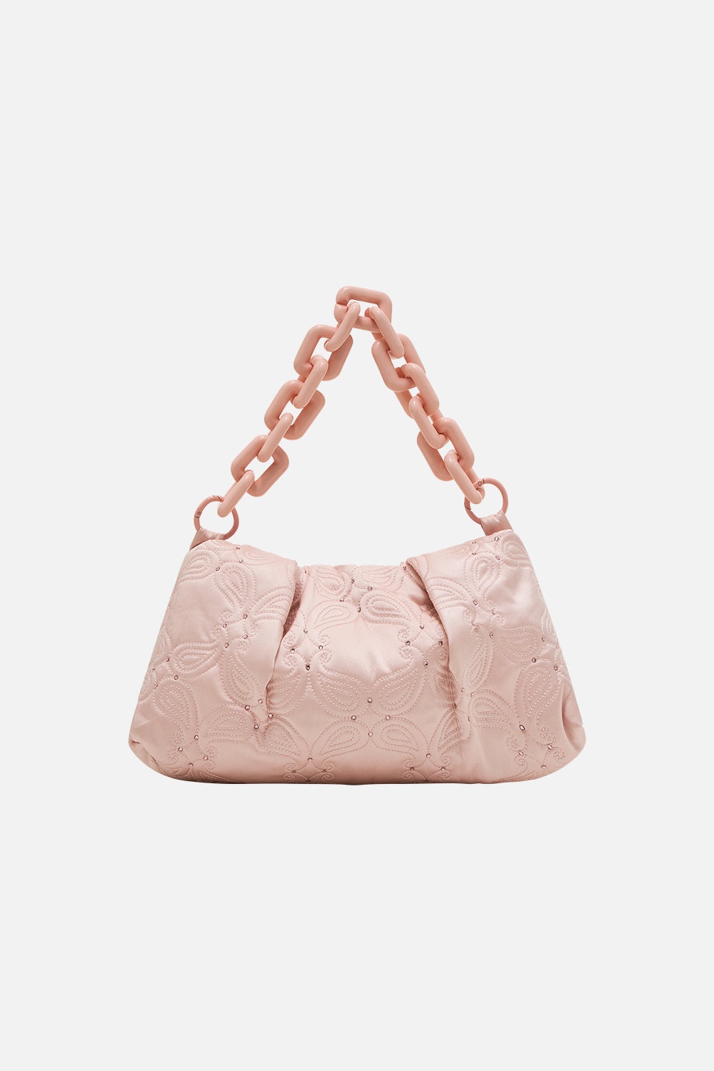 The Solid Black Small Clutch With Chain is an immersion into sophisticated black and shimmering adornments This luxury evening clutch bag features a quilted body adorned with custom a custom chain strap and shimmering crystal embellishments for ultimate opulence. Explore more from the Wonderkind collection. - Lovingly Handcrafted - Designed in Australia - CAMILLA Accessories - Quilted design - Chunky chain strap - Satin finish - Crystal embellished - W 33.5cm x H 20cm SKU 00029329-SOLIDPIN-O/S Fabric and Care MAIN-100% SILK LINING 100% VISCOSE Silk satin embodies a sumptuously smooth finish that offers a rich buttery touch to the skin. As a result of the satin weaving technique, it masterfully creates a fuller bounce to the body and drape details.