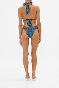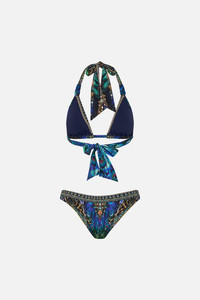 Designed in Australia, the Dominican Decadence Bikini Set With Fabric Tab Detail unfolds in decadent plumes and iridescent blues, teal waves shimmer like glass, capturing the sparkle of forgotten monuments. Lovingly handcrafted, this luxury bikini set features a bikini top and bottom with tab details, the fitted silhouette of the brief showcases a dipped front waist while the top has removable soft cups for added support. - Fits B-C Cup - Removable Soft Cups - Fabric Tab Detail On Bra And Side Front Pant - Dipped Waist Pant - Lurex Jersey Fabrication - Crystal Embellishment SKU 00035541-DOMIDECA-XS Fabric and Care MAIN: 82% REGENERATED POLYAMIDE, 18% ELASTANE ECONYL® is regenerated nylon, crafted from waste materials that would otherwise end up polluting our Mother Earth. Its beauty lies in its ability to be recycled, remoulded and ultimately reused time and time again. An infinitely recyclable product that keeps our planet looking beautiful, it opens the door to a circular fashion sphere.