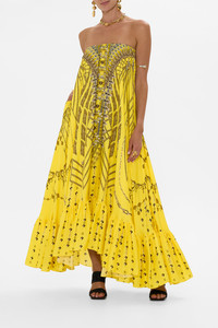 Designed in Australia, The Shrine Of Sunshine Strapless Maxi With Ruffle Hem embraces the ethereal charm of ancient realms. This design features gleaming yellow tones interwoven with delicate flecks of gold, capturing the timeless elegance and divine radiance of deities. Lovingly handcrafted, this maxi dress features a flared silhouette with a strapless design and optional straps. The ruffle hem adds a touch of elegance, while the invisible zip at the center back ensures a seamless fit. - Flare Silhouette - Strapless Design - Ruffle Hem - Invisible Zip at Centre Back - Optional Straps - Crystal Embellishment SKU 00036238-SHRINSUN-XXS Size and Fit Our model wears a CAMILLA S and is 5'10 (178cm) tall. Her standard dress size is an AU 10. She has a 32in (83cm) bust, 35in (89.5cm) hips and a 25in (66cm) waist. Camilla S = AU10 / UK10 / US6 Fabric and Care 100% silk Silk twill is renowned for its diagonally-patterned weave and fluid texture. Its high thread count ensures rich density and durability, while its beautiful sheen provides a luscious touch to the skin.