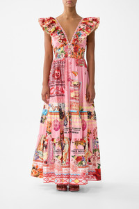 The Collage Kingdom Tiered Dress With Neck Frill is a handcrafted silhouette designed by our in house artisans. Reimagined in an exclusive limited edition print, this dress is crafted with a fitted waist and adjustable ties for versatility. It features a deep v neckline that falls into a tiered, floor length skirt. Its finished with a double layer neck frill, optional modesty clip at bustline and crystal embellishments for luminous detail. - 100% Organic Cotton - Fitted Waist With Adjustable Tie Back - Full Length - Deep V Button Neck With Modesty Clip - Double Layer Neck Frill - Tiered Skirt - Crystal Embellishment SKU 00038329-COLLKING-XXS Size and Fit Our model is 5'10 (178cm) tall and wears a size S (AU 10). Bust: 40in (101.6cm) Waist: 26.5in (67cm) Hips: 38in (96.5cm) Designed and fitted true to size, take your normal size. Fabric and Care 100% ORGANIC COTTON Organic cotton poplin is sumptuously smooth with a crisp, refined weave. This lightweight silken fabric drapes beautifully and is ideal for sleek contours and tailored, defined styles.