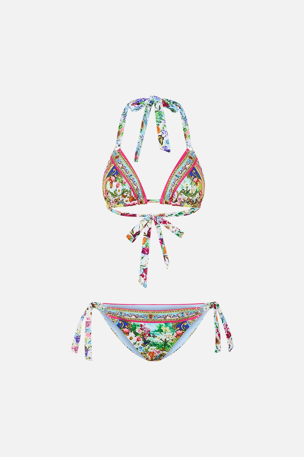 Designed in Australia, the Spirit Of Santa Maria Soft Tie Tri Bikini Set With Trims dances in pastel hues and vibrant painterly graphics, inspired by the electric beauty of Igreja Matriz De Santa Maria and its radiant frescoes. Lovingly handcrafted, this luxury bikini features a triangle bikini top with custom ring details paired with a tie side bikini bottom in matching bespoke CAMILLA print. - To Fit B-C Cup - Removable Soft Cups - Ring Trim Detail - Tie Side Pant - Cheeky Bottom Coverage SKU 00035611-SPIRMARI-XS Fabric and Care MAIN: 82% REGENERATED POLYAMIDE, 18% ELASTANE ECONYL® is regenerated nylon, crafted from waste materials that would otherwise end up polluting our Mother Earth. Its beauty lies in its ability to be recycled, remoulded and ultimately reused time and time again. An infinitely recyclable product that keeps our planet looking beautiful, it opens the door to a circular fashion sphere.