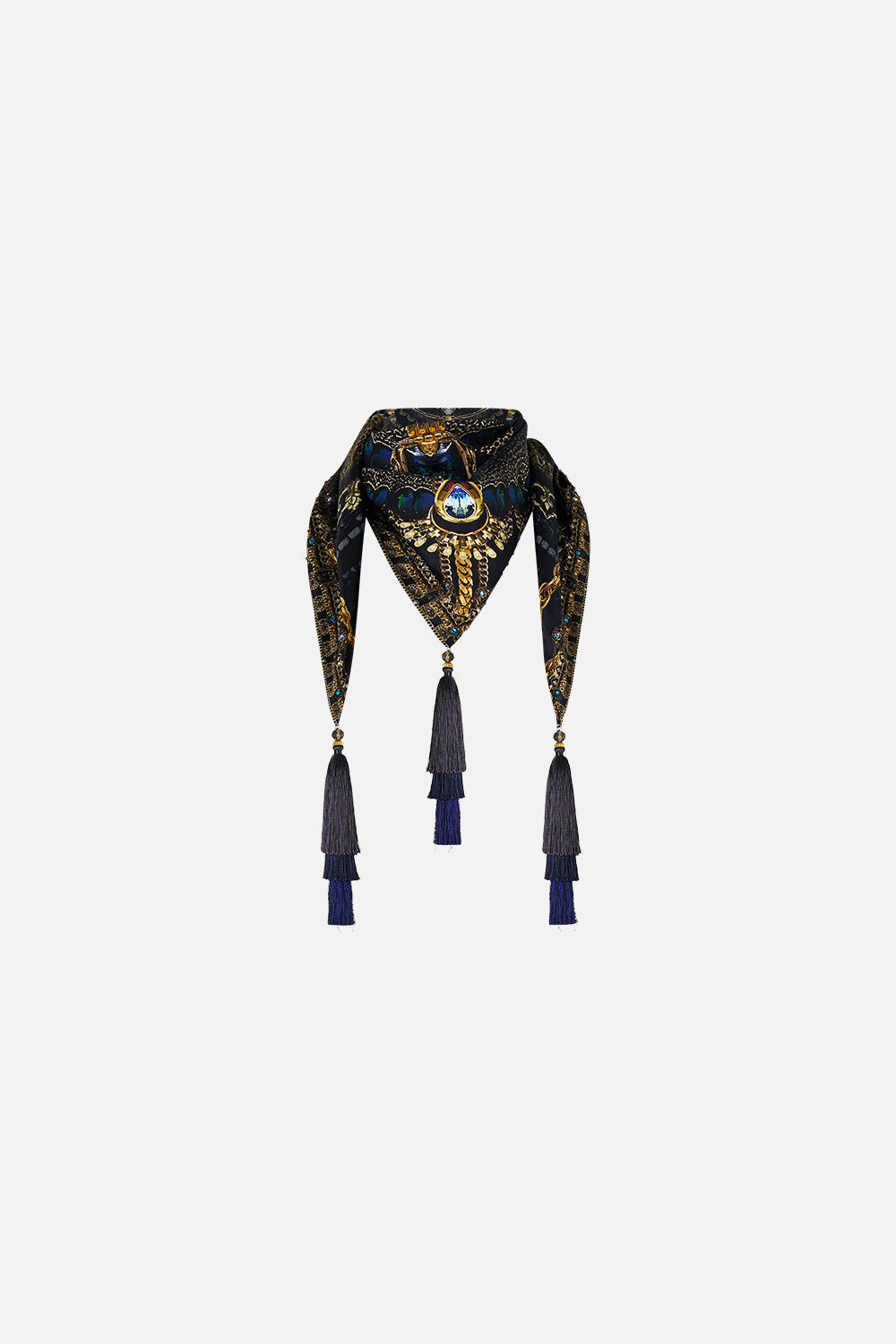 The Song Of The Solstice Triangle Scarf With Tassels is a handcrafted silk silhouette designed by our in house artisans. Reimagined in an exclusive limited edition print, our triangle shaped scarf features large tassels and intricately applied crystal embellishments. - 100% Silk - Camilla Printed - Crystals - Large Tassels - Triangle Shape - 97cm X 45cm SKU 00037710-SONGSOLS-O/S Size and Fit Our model wears a CAMILLA O/S and is 5'10 (178cm) tall. Her standard dress size is an AU 10. She has a 32in (83cm) bust, 35in (89.5cm) hips and a 25in (66cm) waist. Fabric and Care MAIN: 100% SILK Silk twill is renowned for its diagonally-patterned weave and fluid texture. Its high thread count ensures rich density and durability, while its beautiful sheen provides a luscious touch to the skin.