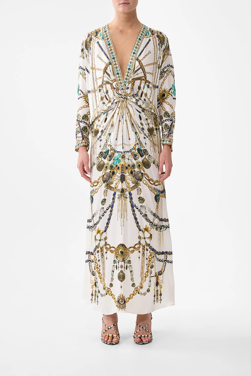 The Chain Gang Twist Front Batwing Dress is a handcrafted silhouette designed by our in house artisans. Reimagined in an exclusive limited edition print, our batwing dress features a statement twist across the front and full-length sleeves. Finished with crystal embellishment, a modesty button has been added at the neckline for styling versatility. - 100% Silk - Twist Front - Batwing Sleeve - Long Sleeve - Crystal Embellishment SKU 00038941-CHAINGNG-XXS Size and Fit Our model is 5'10 (178cm) tall and wears a size S (AU 10). Bust: 40in (101.6cm) Waist: 26.5in (67cm) Hips: 38in (96.5cm) Designed as a relaxed fit. Take your normal size, or select one size smaller for a neater fit. Fabric and Care 100% SILK C-100% SILK Silk satin embodies a sumptuously smooth finish that offers a rich buttery touch to the skin. As a result of the satin weaving technique, it masterfully creates a fuller bounce to the body and drape details.