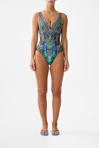 Designed in Australia, the Dominican Decadence V Wire One Piece unfolds in decadent plumes and iridescent blues, teal waves shimmer like glass, capturing the sparkle of forgotten monuments. Lovingly handcrafted, this one-piece, designed for D cups features removable soft cups and a v-wire front neck. Its regular leg line ensures timeless elegance, blending comfort with daring allure. - Fits D Cup - Removable Soft Cups - V Wire Front Neck - Regular Leg Line - Scoop Back - Crystal Embellishment SKU 00035650-DOMIDECA-XS Fabric and Care MAIN: 82% REGENERATED POLYAMIDE, 18% ELASTANE ECONYL® is regenerated nylon, crafted from waste materials that would otherwise end up polluting our Mother Earth. Its beauty lies in its ability to be recycled, remoulded and ultimately reused time and time again. An infinitely recyclable product that keeps our planet looking beautiful, it opens the door to a circular fashion sphere.