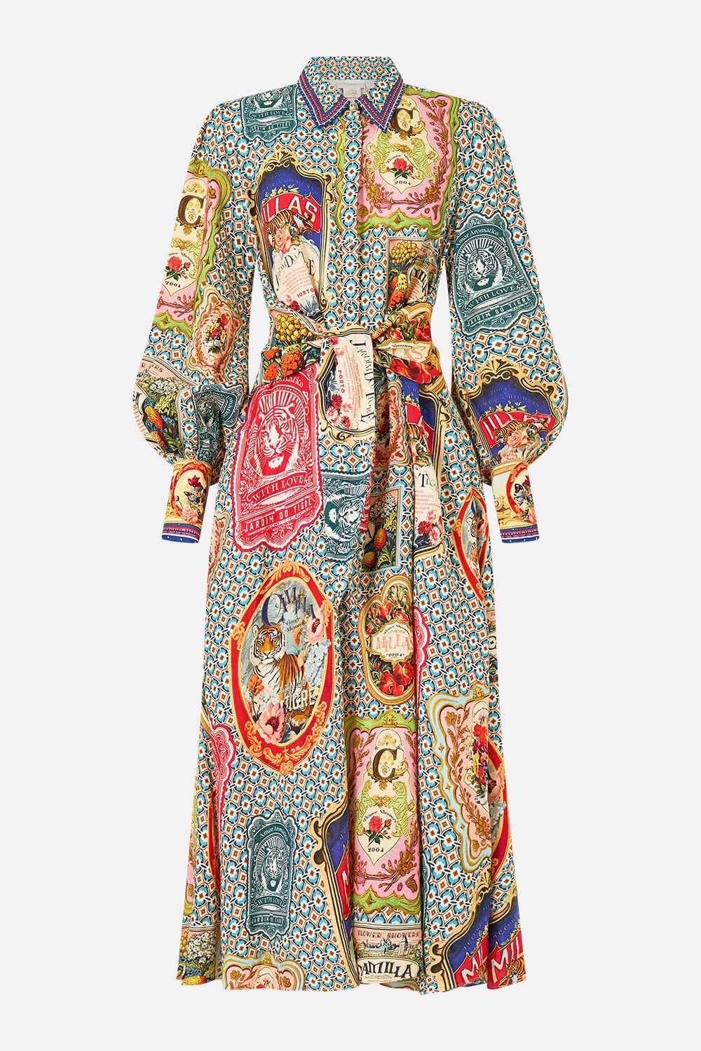 Designed in Australia, the Soap Opera Waist Tie Shirt Dress captures the essence of handcrafted soap packaging with painterly graphics—a kaleidoscope of hues to brighten your day. Lovingly handcrafted, this elegant CAMILLA shirt dress showcases a sleek collar detail that flows into a button-through enclosure on a slightly relaxed fitting straight silhouette across the body. Relaxed full-length sleeves are adorned with wide split cuffs that fall past the wrists to create a visually elongated line to this exquisite silk mini dress. - Fitted At Waist With Flare Skirt - Midi Length - Tie Front Waist - Button Through Front - Midi Length SKU 00034926-SOAPOPER-XXS Size and Fit Our model wears a CAMILLA S and is 5'10 (178cm) tall. Her standard dress size is an AU 10. She has a 32in (83cm) bust, 35in (89.5cm) hips and a 25in (66cm) waist. Camilla S = AU10 / UK10 / US6 Designed and fitted true to size, take your normal size. Fabric and Care 100% LINEN Made from flax fibres, this lightweight natural fibre offers a timeless aesthetic that adds durability and longevity to any wardrobe. Its breathability keeps your skin cool, minimises moisture and ensures effortless comfort.
