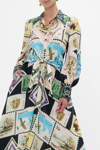 Designed in Australia, My Porto Pen Pal Waist Tie Shirt Dress showcases vintage postcards and stamps, reflecting a nostalgic journey that blends memories and wanderlust into every illustration. Lovingly handcrafted, this elegant CAMILLA shirt dress showcases a sleek collar detail that flows into a button-through enclosure on a slightly relaxed fit straight silhouette across the body. Relaxed full-length sleeves are adorned with wide split cuffs that fall past the wrists to create a visually elongated line to this exquisite mini dress. - Tie Front - Button Through - Collar - Shirring At Back Waist - Crystal Embellishment - Non-Sheer - Pockets SKU 00033315-PORTOPAL-XXS Size and Fit Designed and fitted true to size, take your normal size Fabric and Care 80% LINEN,20% SILK Grown organically, this lightweight natural fibre offers a timeless aesthetic that adds durability and longevity to any wardrobe. Its breathability keeps your skin cool, minimises moisture and ensures effortless comfort.