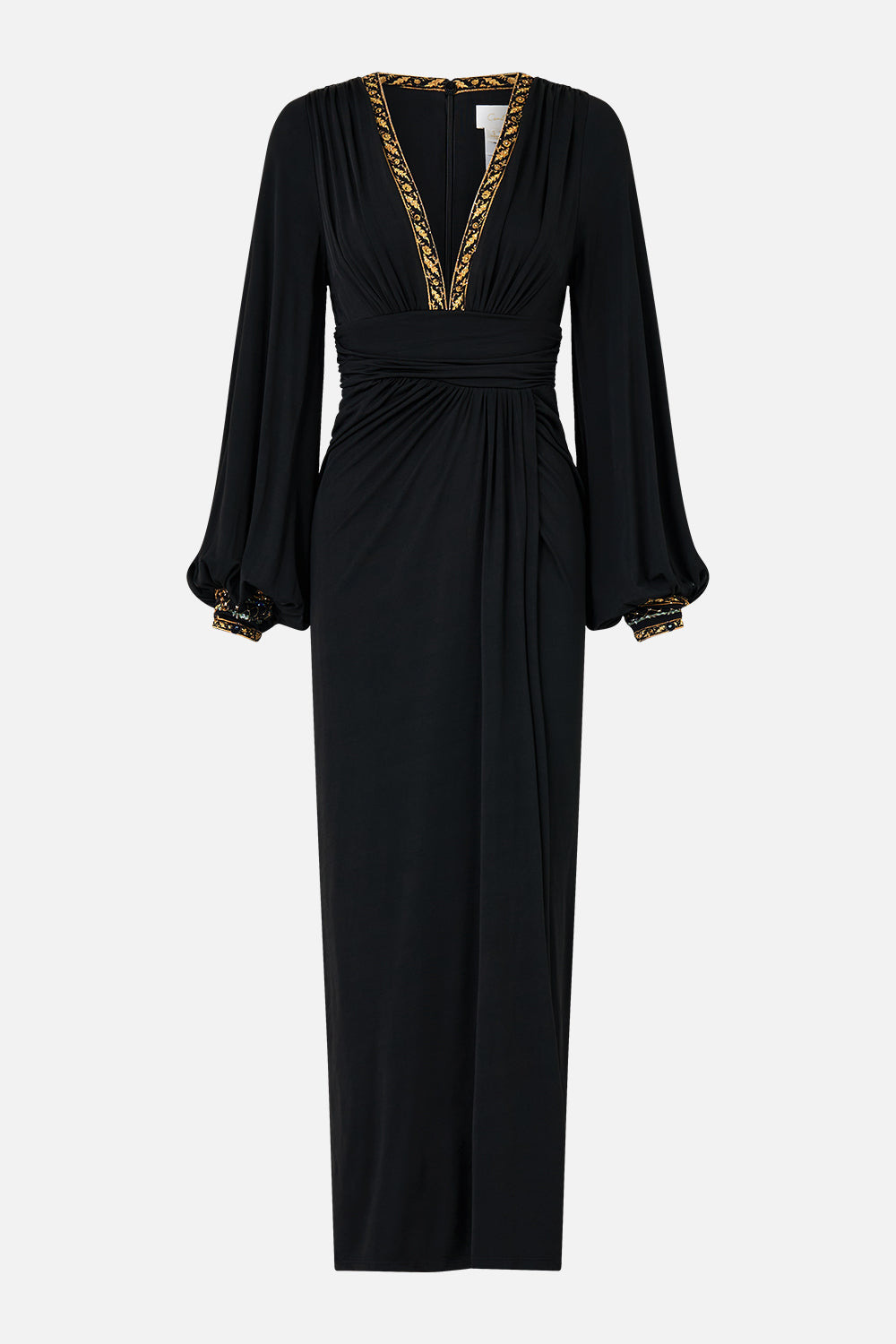 The Ottoman Elegance Waisted Draped Jersey Dress is a handcrafted silhouette designed by our in house artisans. Reimagined in an exclusive limited edition print, our maxi jersey dress features a draped and gathered band that contours the waist. Blouson sleeves add soft structure and effortless movement. - Slim Fit - Fitted Gathered Waistband - Long Draped Dress - Blouson Sleeve SKU 00036702-OTTOELEG-XS Size and Fit Our model is 5'10 (178cm) tall and wears a size S (AU 10). Bust: 40in (101.6cm) Waist: 26.5in (67cm) Hips: 38in (96.5cm) Fabric and Care 92% VISCOSE 8% ELASTANE Viscose is a fibre crafted from the natural substance, cellulose, known for its softness, breathability and drape. It possesses a subtle sheen and is perfect for lightweight soft tailored silhouettes or more structured styles in heavier weights.
