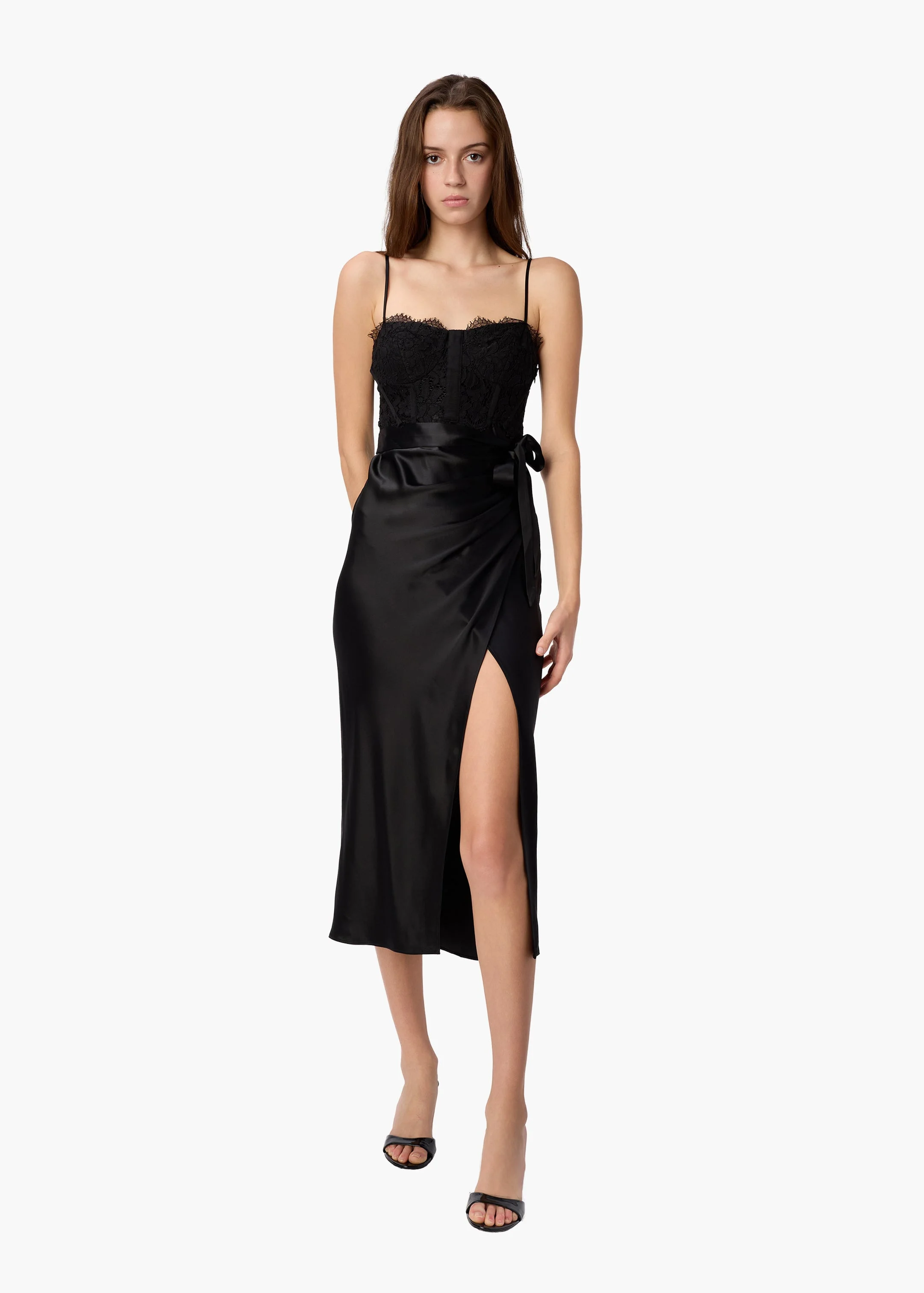 MIDWEIGHT REFINED SATIN THE TRICIA CORSET DRESS IN BLACK IS CRAFTED TO FLATTER AND CAPTIVATE WITH EVERY WEAR. THIS MIDI‑LENGTH DRESS FEATURES A STRUCTURED LACE CORSET BODICE WITH UNDERWIRE AND BONING FOR DEFINITION AND SHAPE, SEAMLESSLY PAIRED WITH A SLEEK REFINED SATIN SKIRT THAT MOVES EFFORTLESSLY WITH YOU. THE DESIGN BEGINS WITH A SHEER SCALLOPED LACE EDGE ALONG THE TOP OF THE BODICE THAT BRINGS ROMANTIC, FEMININE DETAIL TO THE NECKLINE, WHILE ADJUSTABLE STRAPS PROVIDE A COMFORTABLE, CUSTOMIZABLE FIT. THE CORSET IS FULLY LINED FOR COMFORT, AND THE SATIN SKIRT ADDS A FLUID, REFINED PROFILE THAT MAKES THIS DRESS PERFECT FOR EVENING EVENTS AND SPECIAL OCCASIONS. PRODUCT FIT TRUE TO SIZE MODEL WEARS SIZE 0 AND IS 5'9 FABRIC & CARE POLY ACETATE/LACE; 73% ACETATE, 27% POLYESTER/ 37% RAYON, 32% COTTON, 31% NYLON DRY CLEAN AND STEAM ONLY IMPORTED