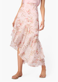 LIGHTWEIGHT SILK CHIFFON THE YAZMEENA CHIFFON SKIRT IN FLORAL PRINT COMBINES FLUID MOVEMENT WITH ELEVATED PROPORTIONS. CRAFTED FROM LIGHTWEIGHT SILK CHIFFON, IT FEATURES CASCADING CROSS-OVER FLOUNCES AND A HIGH-WAISTED SILHOUETTE WITH HIDDEN ELASTIC FOR EFFORTLESS FIT AND MOTION. IT PAIRS BEAUTIFULLY WITH TEES AND SANDALS OR ELEVATED TOPS AND HEELS FOR REFINED VERSATILITY. PRODUCT FIT TRUE TO SIZE MODEL WEARS SIZE XS AND IS 5'9 FABRIC & CARE SILK CHIFFON; 100% SILK DRY CLEAN ONLY IMPORTED