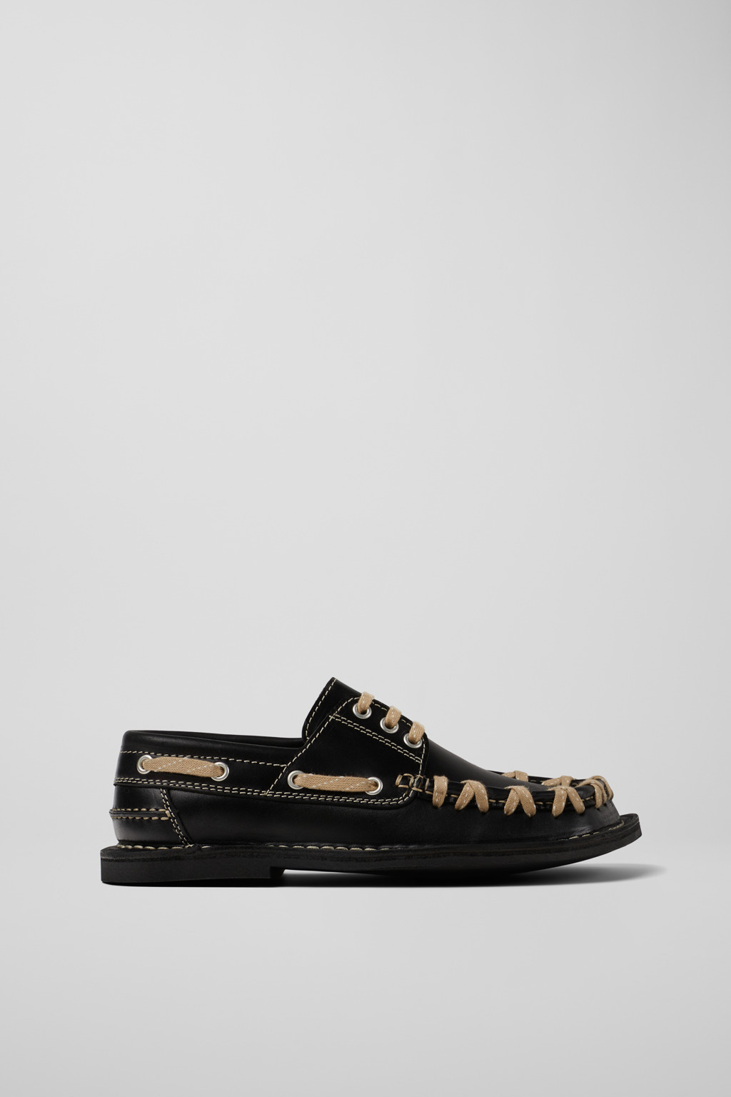 Black calfskin leather boat shoes with cream lacing, characterized by a strong square toe and rubber outsoles. Features Upper Calfskin leather Color Black Outsole/Features Rubber Outsole> Lining 88% Calfskin 12% Textile (60% Nylon - 40% PU)