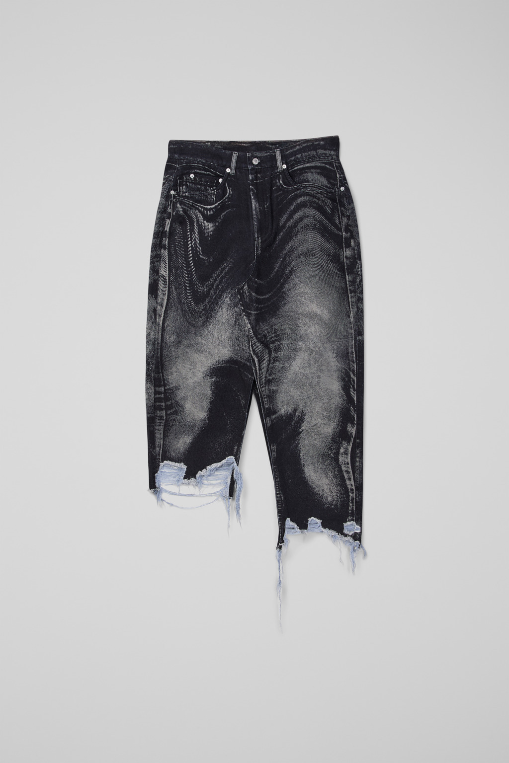 Black-gray skirt with distressed asymmetrical hem. Italian Candiani denim made with responsibly sourced Blue Seed Cotton fibers and recycled garment waste for enhanced durability and a soft feel.<br/><br/>. Features Material 76% Organic Cotton, 24% Recycled Cotton Color Black-Gray Features - Zip and button fly Size and Fit Relaxed unisex fit