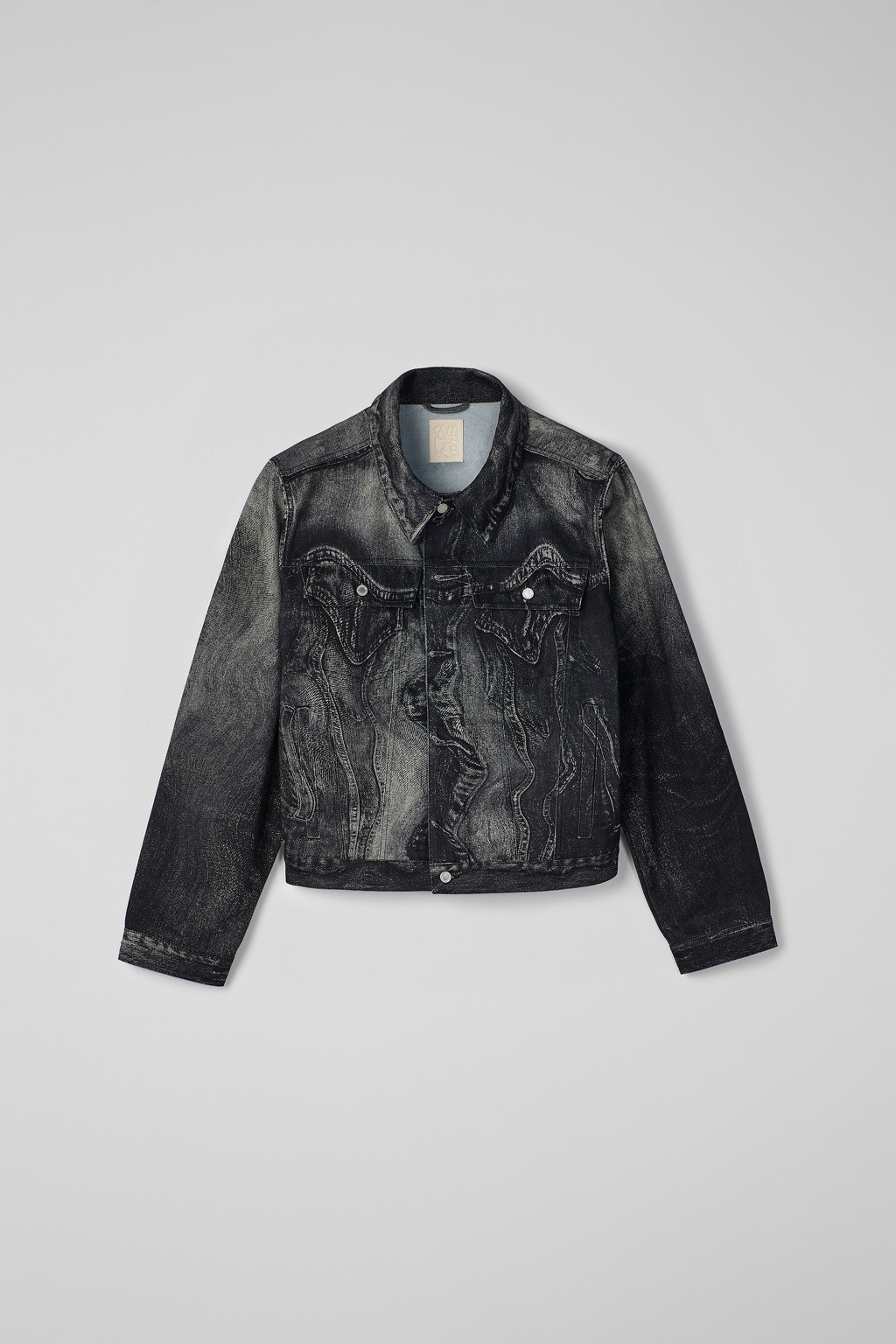 Black-gray jacket in premium Italian Candiani denim with CAMPERLAB's signature distorted print. Features Material 100% Organic Cotton (76% organic cotton - 24% upcycled postconsumer waste) Color Black-Gray Features Relaxed unisex fit Two buttoned chest pockets Two slash body pockets Adjustable waist button Size and Fit Unisex For a more fitted look, choose 1 - 2 sizes smaller than your regular size. Sleeves may be long on smaller frames. Male model is 189cm and wearing size M Female model is 179cm and wearing size M