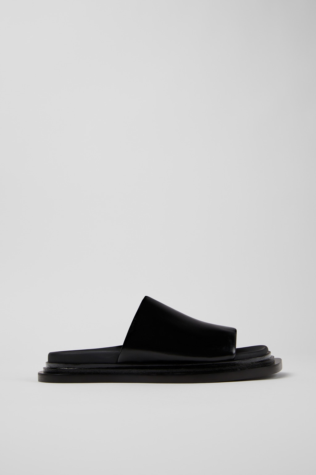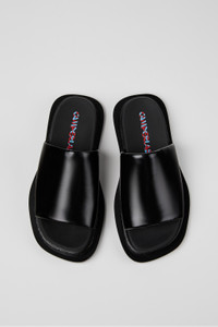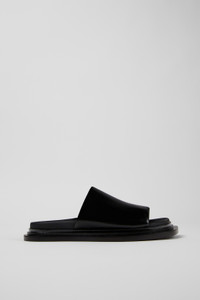 Black leather sandals. PU footbeds, rubber and EVA covered leather outsoles. Features Upper 100% Leather (snake effect) Color Black Outsole/Features Rubber & EVA Insole Anatomical PU Non-Removable Footbed Lining 100% Leather