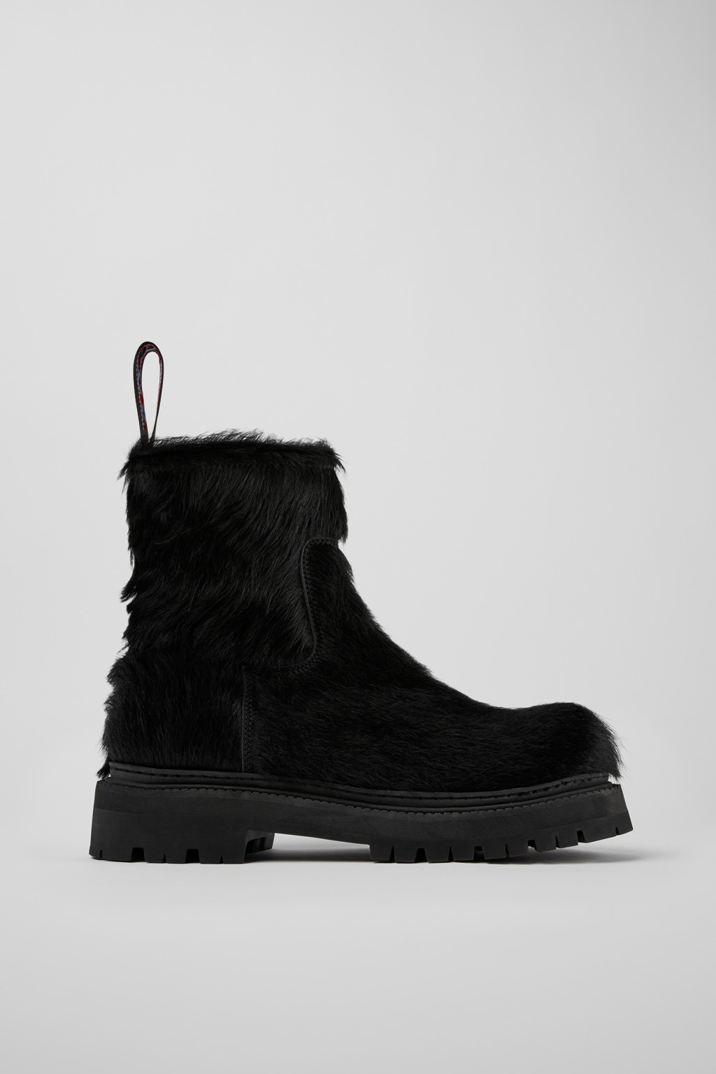 Black long hair boots with rubber outsoles. Features Upper Calfskin (Leather Working Group Certified) Color Black Outsole/Features Rubber / EVA Side zip Insole OrthoLite® for cushioning Lining 73% calfskin 27% recycled polyester