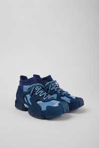 Blue caged sneakers with water-repellent 3D-knitted PET sock interiors, direct injection TPU exteriors, and recycled PU outsoles. Fully recyclable. Features Upper Textile / Synthetic Color Blue Outsole/Features PU / TPU Insole PU Lining 80% textile (75% recycled polyester - 14% Hilo PU - 11 spandex) 20% recycled polyester