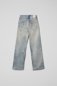 Blue jeans in quality Candiani Italian denim for enhanced durability and a soft feel. Featuring a seasonal contrast-color print for a bold urban look. Features Material 76% Organic Cotton, 24% Recycled Cotton Color Blue Features - Zip and button fly - Belt loops Size and Fit Relaxed unisex fit. Straight leg, long length. For a looser fit that sits lower on the hips, size up. Male model is 189cm and wearing size 30 Female model is 179cm and wearing size 28 Female Model Measurment Bust: 80 cm Waist: 60 cm Hips: 88 cm Male Model Measurment Bust: 88 cm Waist: 69 cm Hips: 90 cm