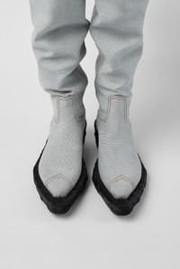 Blue knee-high cowboy boots with quality soft-feel Candiani denim for durability, EVA footbeds, and rubber outsoles. Features Upper Candiani denim Color Blue Outsole/Features 66% Rubber, 29% Natural Rubber, 5% TENCEL ™ Lyocell Insole - EVA Footbed Lining 90% Cotton, 7% Textile with Synthetic Finish (55% PU, 45% Recycled Polyester), 3% Calfskin