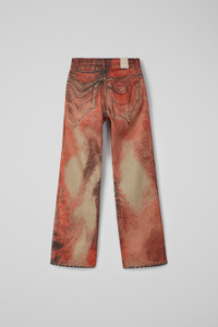 Burnt orange jeans in premium Italian Candiani denim with CAMPERLAB's signature distorted print. Features Material 100% Organic Cotton (76% organic cotton - 24% upcycled postconsumer waste) Color Orange Features Zip and button fly Belt loops Regular waist Long inseam length 5-pocket construction Size and Fit Relaxed unisex fit. Straight leg, long length. Male model is 191 cm and wearing size 30 Female model is 178 cm and wearing size 28
