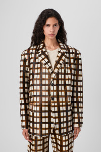 Cream-brown tartan hair-on-leather blazer with a unique, natural look. Small imperfections and irregularities in the pattern reflect the authenticity of the material. Features Material Hair-on leather Color White Size and Fit - Relaxed tailoring - True to size fit - For formal and casual styling - Sharp, defined shoulder