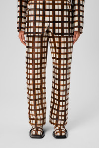 Cream-brown tartan hair-on-leather trousers with a unique, natural look. Small imperfections and irregularities in the pattern reflect the authenticity of the material. Features Material Hair-on leather Color White Size and Fit - Relaxed fit - Mid-rise - Full length