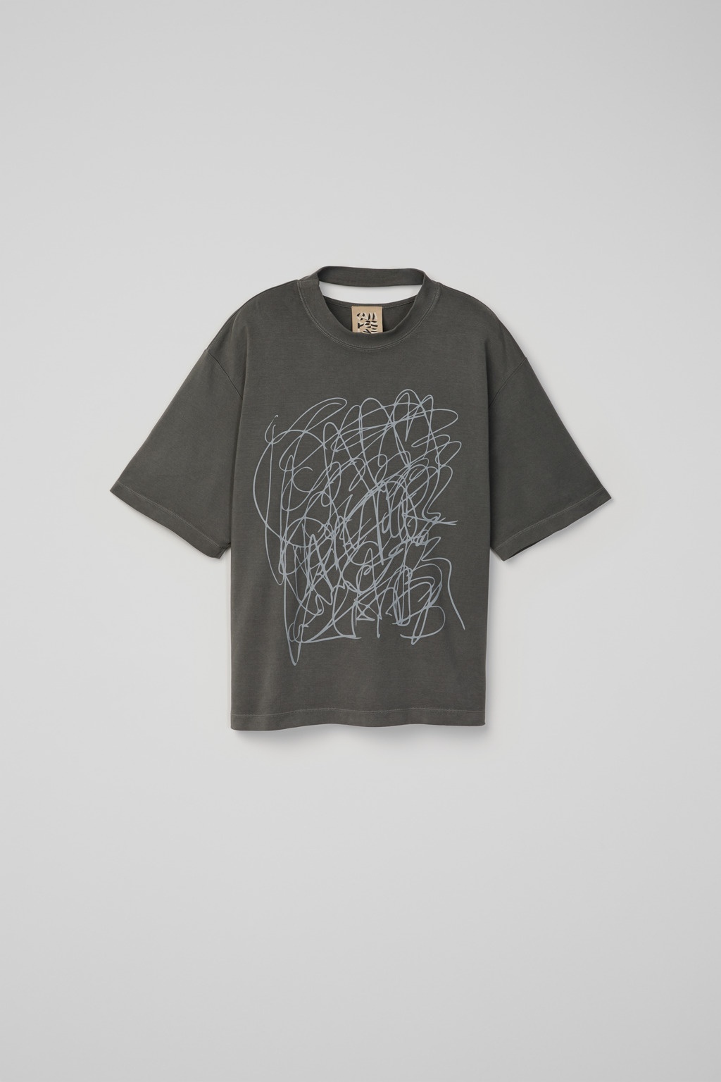 Faded Black T-shirt in 100% mineral-dyed organic cotton with cut-out detail at back and seasonal print. Features Material 100% Organic Cotton Color Faded Black Features Cropped length Printed scribbled logo artwork at front Cut-out neck detail Size and Fit Unisex For a more cropped look, size down. Male model is x cm and wearing size Female model is x cm and wearing size