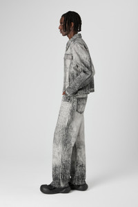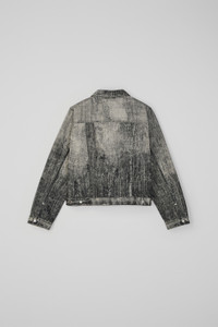 Faded black jacket in quality Candiani Italian denim, made from a soft washed organic cotton, featuring seasonal paint print. Features Material 100% Organic Cotton Color Faded Black Features Relaxed unisex fit Two buttoned chest pockets Two slash body pockets Adjustable waist button Size and Fit For a more fitted look, choose 1 - 2 sizes smaller than your regular size. Male model is 191 cm and wearing size 30 Female model is 178 cm and wearing size 28