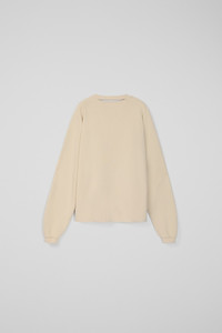 Faded Sand crewneck jersey with a unique cut-out neck detail. Made from a blend of PYRATEX® certified organic cotton and circulose fiber, sourced from post-consumer textile waste, this fabric is crafted using renewable energy. A perfect blend of style and sustainability Features Material 70% Organic Cotton / 30% Viscose (CIRCULOSE®) Color Faded Sand Features Crew neck Medium weight fleece with loopback Cut-out neck collar detail at back Washed look Size and Fit Unisex Boxy fit Male model is 185 cm and wearing size M Female model is 177 cm and wearing size XS
