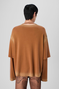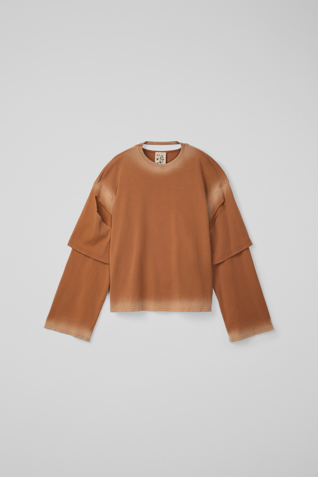 Faded terracotta organic cotton layered long sleeve T-shirt with cut-out details. Featuring hand-applied spray placement for a unique finish. Features Material Organic Cotton Color Faded terracotta with hand-applied spray placement Size and Fit - Relaxed fit - Wide neckline - Clean, structured lines - Dropped shoulder - Non-detachable sleeve layers