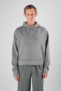 Gray hoodie in 100% mineral-dyed organic cotton with cut-out detail at back. Features Material 100% Organic Cotton Color Gray Features Cropped length Drawstring hood Pouch pocket Printed scribbled logo artwork at back Cut-out neck detail Size and Fit Unisex For a more cropped look, size down. Male model is 189 cm and wearing size M Female model is 179 cm and wearing size M