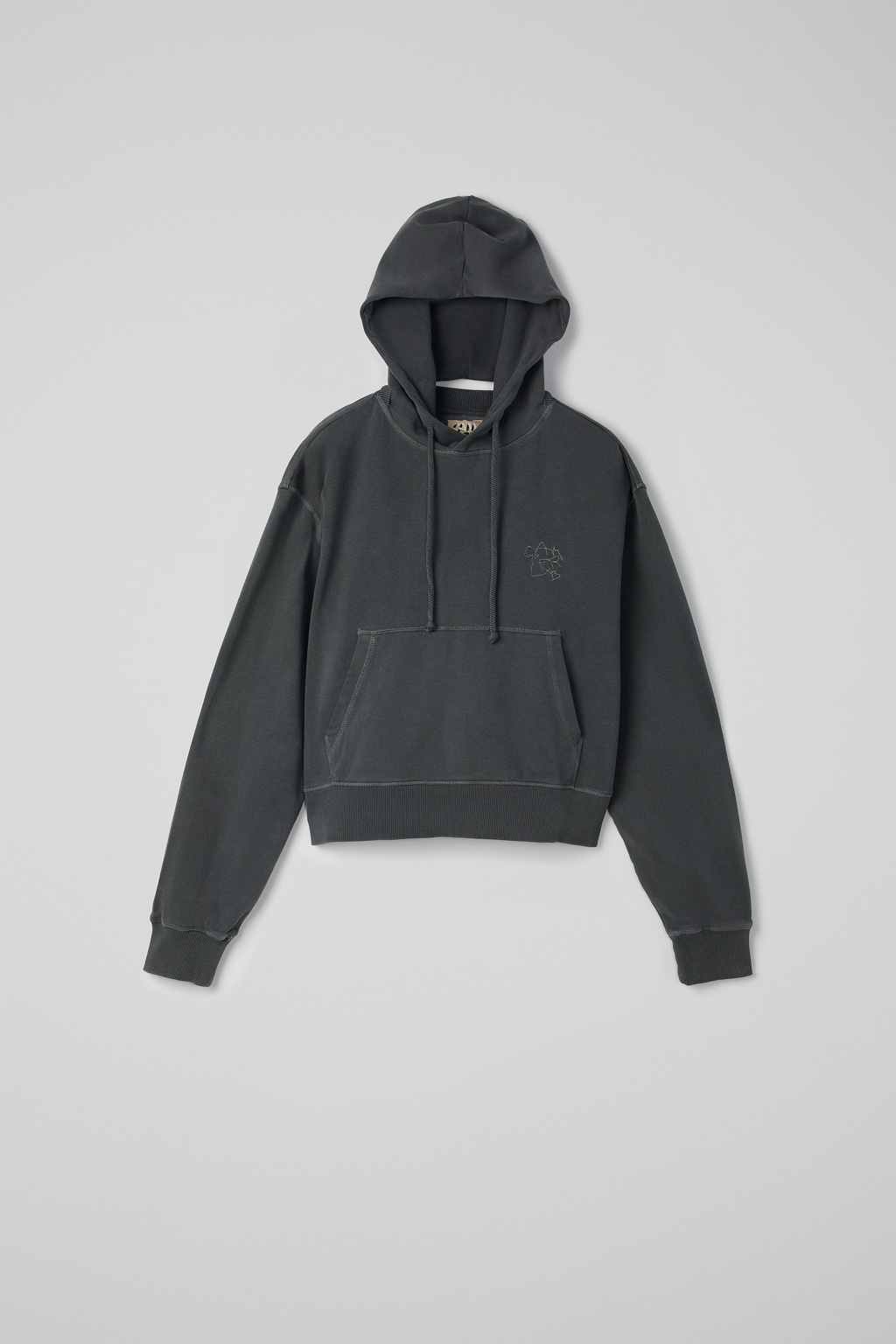 Gray hoodie in 100% mineral-dyed organic cotton with cut-out detail at back. Features Material 100% Organic Cotton Color Gray Features Cropped length Drawstring hood Pouch pocket Tonal logo embroidery at chest Size and Fit Unisex For a more cropped look, size down. Male model is 189cm and wearing size M Female model is 179cm and wearing size M