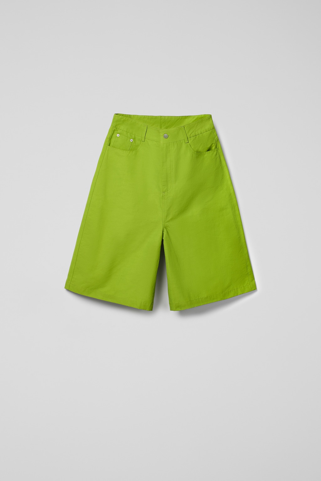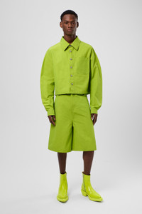 Green shorts made with technical material in an extra durable blend of nylon and recycled cotton. Features Material 60% Cotton, 40% Nylon Color Green Features - Zip and button fly Size and Fit Relaxed unisex fit. For a looser fit that sits lower on the hips, size up. Male model is 189cm and wearing size M Female model is 179cm and wearing size S Female Model Measurment Bust: 80 cm Waist: 60 cm Hips: 88 cm Male Model Measurment Bust: 88 cm Waist: 69 cm Hips: 90 cm