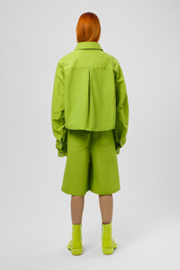 Green shorts made with technical material in an extra durable blend of nylon and recycled cotton. Features Material 60% Cotton, 40% Nylon Color Green Features - Zip and button fly Size and Fit Relaxed unisex fit. For a looser fit that sits lower on the hips, size up. Male model is 189cm and wearing size M Female model is 179cm and wearing size S Female Model Measurment Bust: 80 cm Waist: 60 cm Hips: 88 cm Male Model Measurment Bust: 88 cm Waist: 69 cm Hips: 90 cm