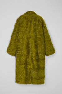 Green textured long-pile coat with an oversized fit. Features Material 50% Modacrylic, 34% Acrylic, 16% Recycled Polyester Color Green Features - Pockets Size and Fit Oversized, full-length silhouette Wide lapel Raglan sleeve