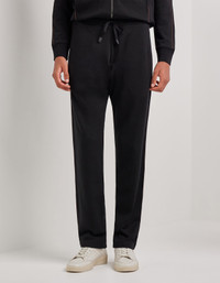 Embellished with elegant Brown piping details, these extra-fine merino wool pants offer a subtle appeal. The texture of the fabric ensures a comfortable fit and a streamlined silhouette that enhances every figure. The perfect piece for the man who seeks a dynamic look without sacrificing pure elegance. FABRICS AND CRAFTSMANSHIP - Long pants - Ribbed waistband with drawstring - Open bottom - 100% wool - Piping - Made in Italy CARE Hand wash max 40° Do not bleach Normal steam or dry iron on low (110°) Gentle dry clean with perchlorethylene Dry flat FIT The model is wearing a size 48 The model measures: Height: 186 cm (73.2 in) Chest: 81 cm (31.9 in) Waist: 70 cm (27.6 in) Hips: 82 cm (32.3 in)