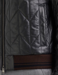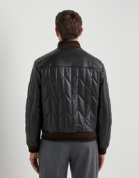 Quilted lambskin nappa leather bomber jacket with a modern fit, finished with knitted details on the collar, cuffs and hem for snug comfort. Lightweight padding and a double-slider zipper add functionality and style to a piece designed for the man who seeks elegance and dynamism, even in the most informal moments. FABRICS AND CRAFTSMANSHIP - Set-in sleeve quilted bomber jacket - Central fastening with double-slider zipper fastening and leather pull - Hand pockets with hidden snap buttons - Knit collar, cuffs and hem - Lightweight padding - Lined piece - Zippered vertical pocket - 100% Lambskin - Made in Italy CARE Do not wash with water Do not bleach Do not iron Do not dry clean Do not tumble dry FIT The model is wearing a size 48 The model measures: Height: 189 cm (74.4 in) Chest: 98 cm (38.6 in) Waist: 82 cm (32.3 in) Hips: 97 cm (38.2 in)