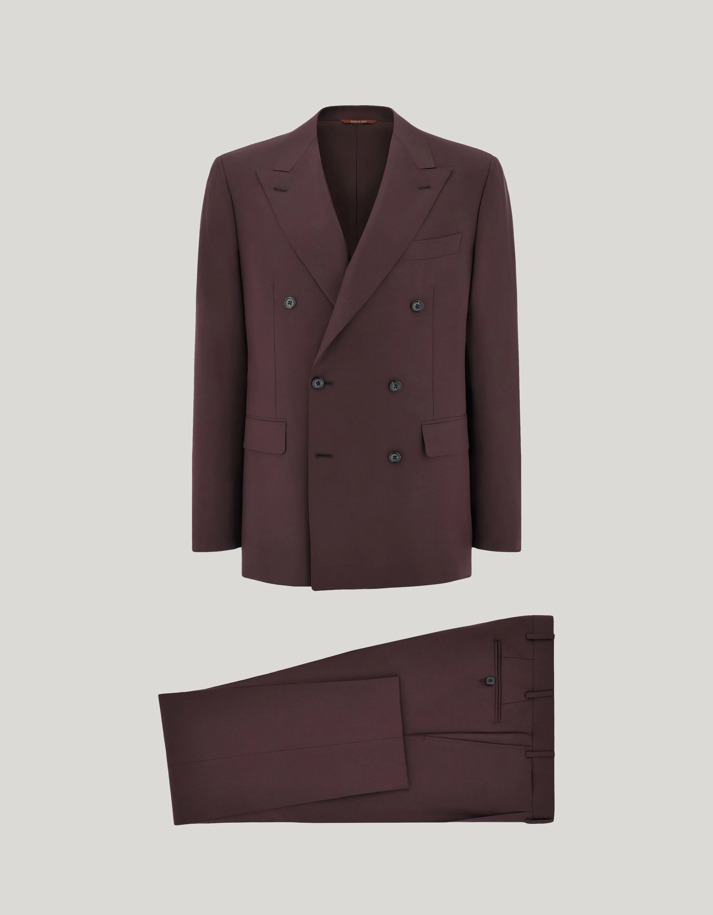 Double-breasted wool suit with refined sallia weave, defined by a lightweight construction and modern fit that enhances the body's lines. The six-button jacket, which is slightly shorter and leaner at the hips, lends impetus and personality, while the pleated pants complete the ensemble with balance and elegance. A garment designed for the man who seeks style and character in any formal setting. FABRICS AND CRAFTSMANSHIP - Double-breasted six-button jacket - Welted pockets with flap and slit breast pocket - Jacket length 74 cm in size 50 - Pants with one pleat - American-style pockets and two welted back pockets - Hem 19 cm - 100% wool - Made in Italy CARE Do not wash with water Do not bleach Normal steam or dry iron on low (150°) Dry clean with perchlorethylene Do not tumble dry FIT The model is wearing a size 50 The model measures: Height: 185 cm Chest: 100 cm Waist: 79 cm Hips: 95 cm Modern fit In the Capri model, the jacket is slightly shorter and more fitted around the hips and chest. Its lightweight design features tailored shirt sleeves and 0.5 cm padded shoulders. These pleatless pants are low-waisted, and have quite a slim fit on the thigh and a narrow pleat at the hem.