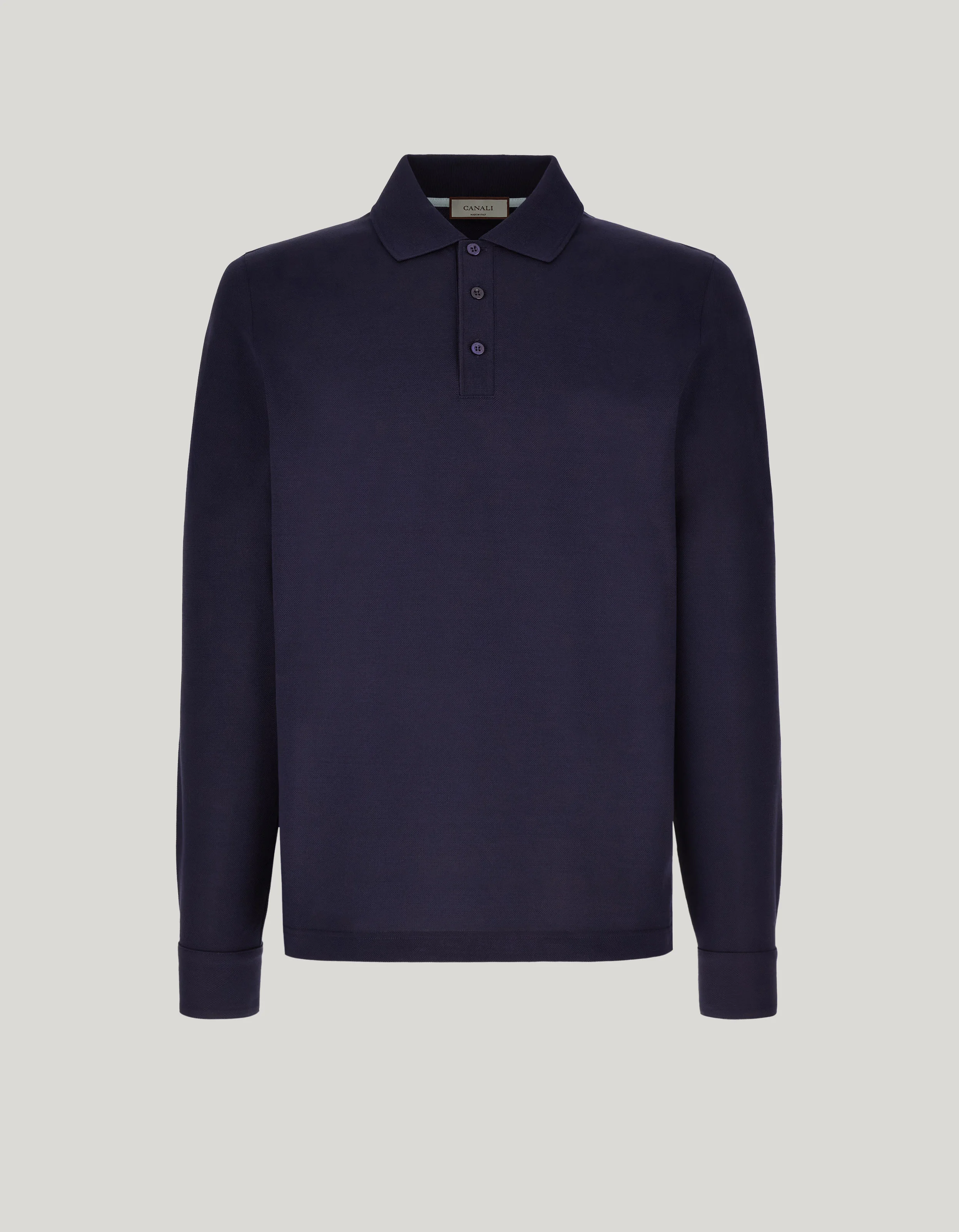 DARK NAVY COTTON AND SILK PIQUÉ LONG-SLEEVED POLO SHIRT
