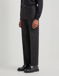 These 5-pocket denim jeans in the crisp lines of the regular fit lines have a relaxed and contemporary soul. In an elegant colour scheme, they are set apart by their branded metal button, custom rivets, and washable genuine leather tag. Radiating practical yet sophisticated casual style, they make a distinctive addition to autumn-winter outfits. FABRICS AND CRAFTSMANSHIP - 5-pocket denim jeans - Regular fit - Central fly with a branded metal button - Internal fabric belt - Custom pocket rivets - Rear patch pockets - Washable genuine leather label on the back of the waistband - Hem width: 22 cm - Comfortable denim - Denim weight: 11.5 ounce - 98% cotton, 2% elastane - Made in Italy CARE Machine wash max 30° - delicate cycle Do not bleach Normal steam or dry iron on low (110°) Do not dry clean Do not tumble dry FIT Regular Fit The model is wearing a size 48 The model measures: Height: 188 cm Chest: 94 cm Waist: 75 cm Hips: 93 cm