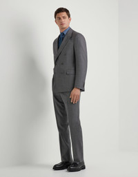 Pure wool suit with double-breasted jacket and peaked lapels, an emblem of elegant tailoring and modern comfort. It offers a balanced fit and a refined silhouette. Designed for the man who wishes to stand out with discretion, it combines impeccable style and functionality, representing an ideal choice for any formal occasion. FABRICS AND CRAFTSMANSHIP - Double-breasted 6-button jacket - Peaked lapels - Welted pockets with flaps and slit breast pocket - Jacket length 76 cm in size 50 - Pleated pants - American-style pockets and two welted back pockets - Hem 20 cm - 100% wool - Made in Italy CARE Do not wash with water Do not bleach Normal steam or dry iron on low (150°) Dry clean with perchlorethylene Do not tumble dry FIT Relaxed The Monza jacket features a more relaxed fit around the shoulders, which are soft and snug, regular jacket length and semi-elasticated waist. High-rise trousers with regular hem. The model is wearing a size 48 The model measures: Height: 189 cm (74.4 in) Chest: 98 cm (38.6 in) Waist: 82 cm (32.3 in) Hips: 97 cm (38.2 in)