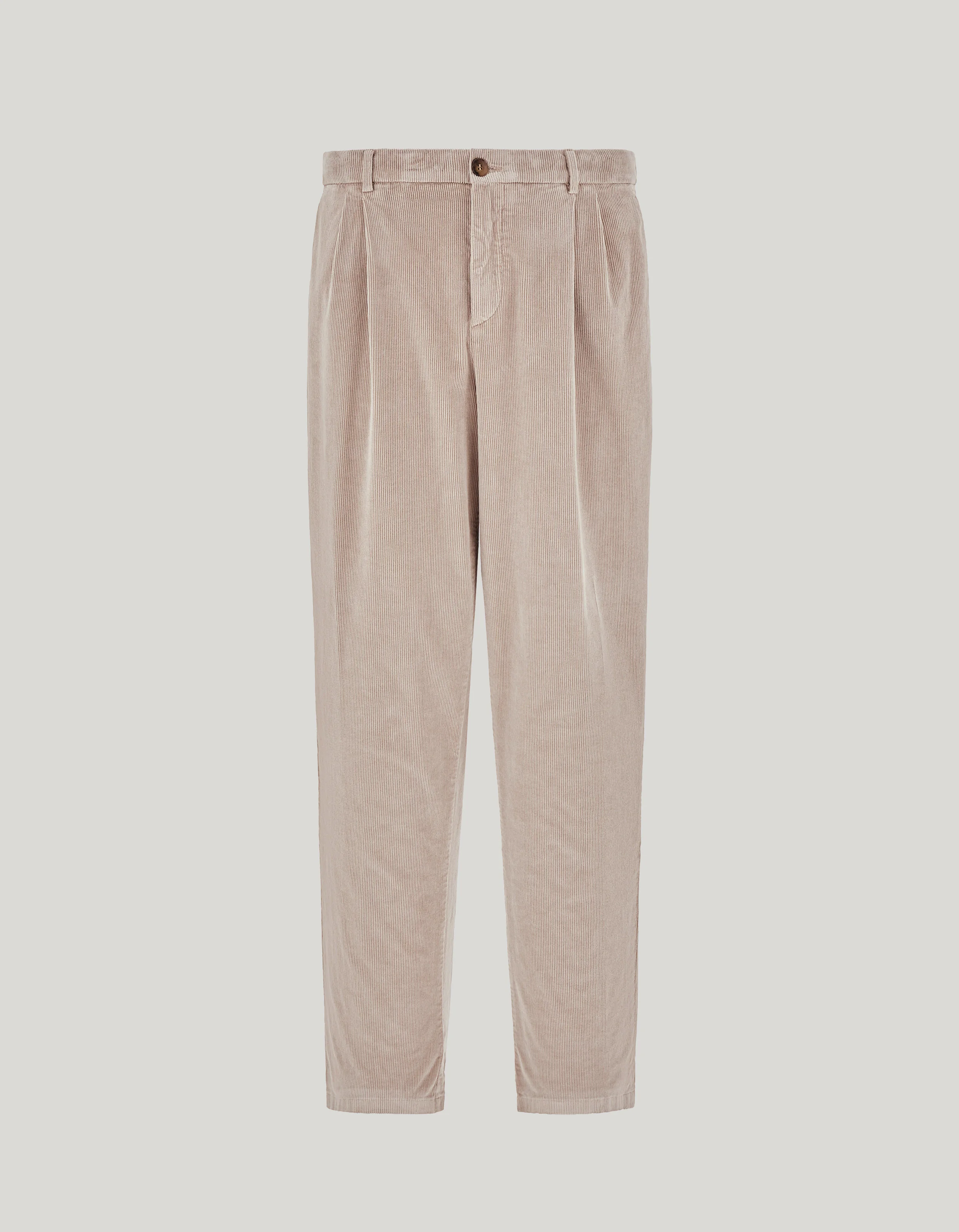 Soft-touch corduroy chinos with two darts, ideal for the man who wants to combine sophisticated comfort and versatility. The soft fabric enriched by a blend of cotton, modal and elastane ensures a perfect fit, while the design with double darts enhances the silhouette naturally. A garment created to enrich the fall wardrobe with style and functionality. FABRICS AND CRAFTSMANSHIP - Chinos with two darts - Central fastening with visible button - Double welt back pockets with exposed button - Hem 24 cm - Garment-dyed comfort soft touch corduroy - 74% Cotton 24% Modal 2% Elastane - Made in Italy CARE Machine wash max 30° - delicate cycle Do not bleach Normal steam or dry iron on low (110°) Gentle dry clean with perchlorethylene Do not tumble dry FIT The model is wearing a size 50 The model measures: Height: 185 cm (72.8 in) Chest: 100 cm (39.4 in) Waist: 79 cm (31.1 in) Hips: 95 cm (37.4 in)