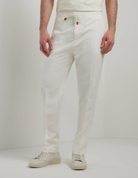 Coulisse pants in linen and silk fabric, to rediscover the pleasure of dressing in style and comfort. The garment combines the timeless elegance of the fabric with the functionality of a regular fit, and an elastic waistband with drawstring and leather ends. Ideal for those seeking a refined yet practical outfit, these trousers ensure excellent freedom of movement for every occasion. FABRICS AND CRAFTSMANSHIP - Drawstring pants with elasticated waist - Regular fit - Central fastening with hidden hook and coulisse construction with leather ends - Back welt pockets - Hem 19 cm - Linen and silk fabric - 57% linen, 43% silk - Made in Italy CARE Do not wash with water Do not bleach Normal steam or dry iron on low (110°) Gentle dry clean with perchlorethylene Do not tumble dry FIT Regular fit The model is wearing a size 50 The model measures: Height: 185 cm (72.8 in) Chest: 100 cm (39.4 in) Waist: 79 cm (31.1 in) Hips: 95 cm (37.4 in)
