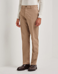 Cotton microtwill blend chino pants designed to offer a dynamic fit and natural freedom of movement. Accompanying the silhouette with understated elegance, they prove to be an essential piece of the contemporary wardrobe for the man who seeks functionality and style with an subtle attitude. FABRICS AND CRAFTSMANSHIP - Flat-front chinos - Tapered fit - Central fastening with visible button - Double welt back pockets with exposed button - Hem 19 cm - Garment-dyed comfort microtwill - 98% cotton 2% Elastane - Made in Italy CARE Machine wash max 30° - delicate cycle Do not bleach Normal steam or dry iron on low (110°) Gentle dry clean with perchlorethylene Do not tumble dry FIT Tapered fit The model is wearing a size 48 The model measures: Height: 186 cm (73.2 in) Chest: 81 cm (31.9 in) Waist: 70 cm (27.6 in) Hips: 82 cm (32.3 in)
